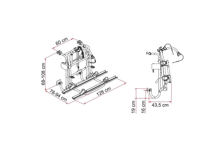 Fietsenrek geschikt voor op de achterwand van de camper. Het enige fietsenrek dat maar liefst tot 77 cm naar beneden kan zakken om het op- en afladen van de fietsen gemakkelijker te maken. Voorzien van veiligheidsriemen die een per ongeluk losschieten voorkomen. Standaard geleverd met twee wielgoten en afstandhouders. Een derde en een vierde wielgoot zijn als optie mogelijk. Maximaal draagvermogen 60 kg verdeeld over vier wielgoten. Draagvermogen per wielgoot 15 kg.