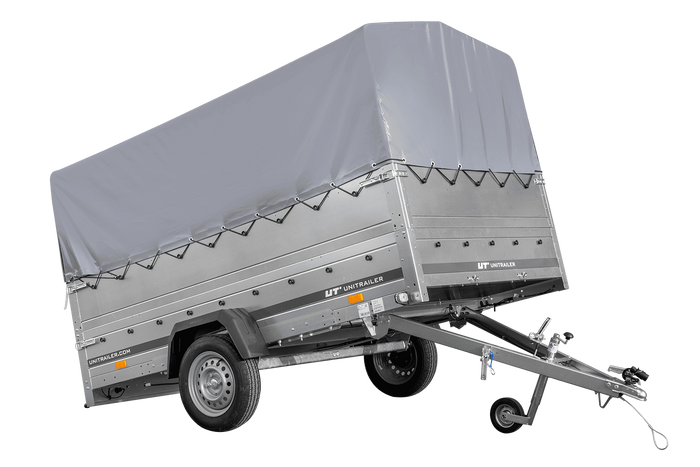 Einachsanhänger 264x150 UNITRAILER GARDEN 265 KIPP mit zusätzlichen Bordwänden, H-800-Rahmen und grauer Plane