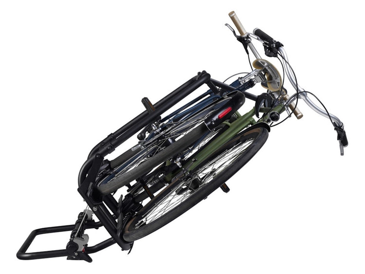 Dieser elegante schwarze Fahrradträger passt auf Standard-A-Rahmen-Deichseln. Der Fahrradträger hat eine maximale Tragfähigkeit von 60 kg, perfekt für den Transport von zwei Fahrrädern oder E-Bikes.